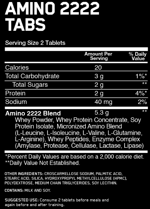 Аминокислоты AMINO 2222 Tabs- содержит 22 аминокислоты. В каждую таблетку входит 1,111 г превосходной протеиновой смеси из аминокислот, извлеченных из ферментативно гидролизованного лактальбумина, соевого протеина, концентрата протеиновой сыворотки, L-орнитина и L-карнитина. Благодаря превосходной смеси из пептидов молочной сыворотки и концентрата сывороточного протеина, AMINO 2222 Tabs обеспечивает организм полным спектром заменимых и незаменимых аминокислот.