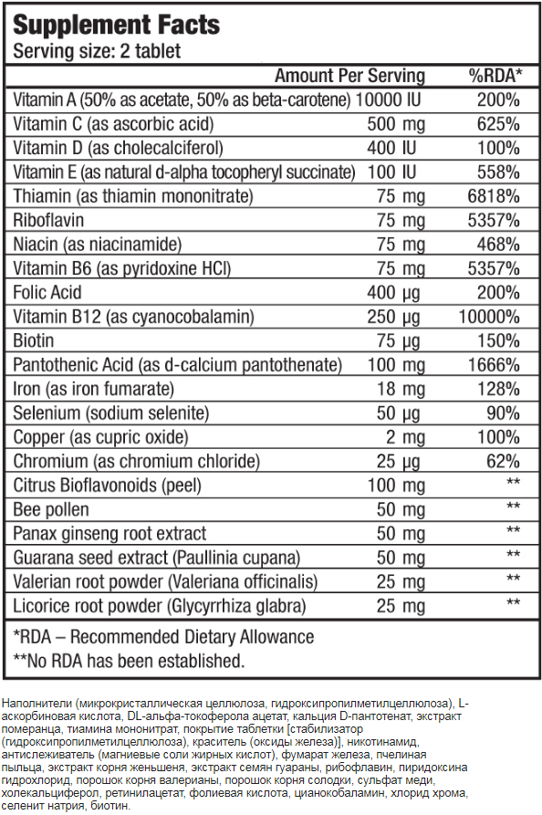 Уникальный продукт B-Complex, содержащий женьшень, биофлавоноиды, экстракт семян гуараны, порошок корня солодки, порошок корня валерианы и даже пчелиную пыльцу.