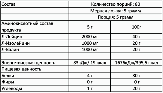 Соотношение лейцина, изолейцина и валина в продукте равно 2:1:1.