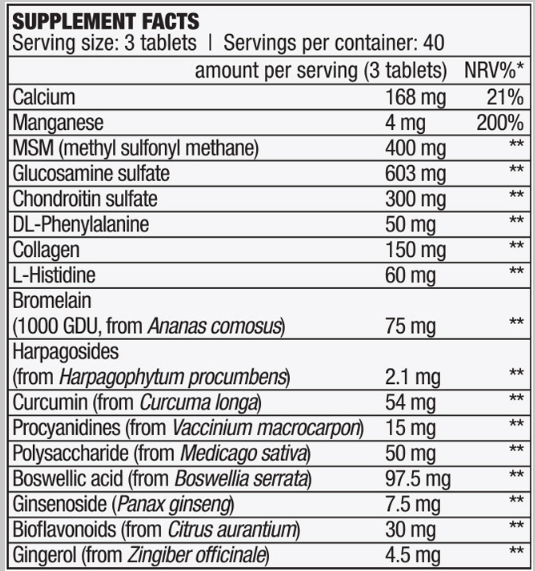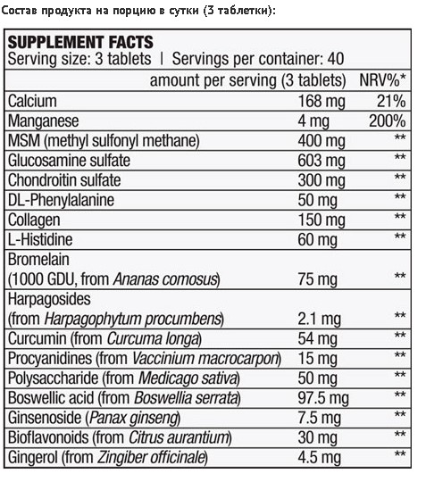 В состав добавки включены: Хондроитин, глюкозамин, экстракты акулы, мидии и хряща цыпленка. Совместное воздействие вышеперечисленных ингредиентов оказывает 100% эффект: снимает воспалительный процесс с последующей регенерацией, до полного восстановления поврежденных связок и суставов. Arthro Guard – отлично укрепляет связки и суставы, на фоне высокоинтенсивного тренинга с использованием предельных отягощений. Для полноценного восстановления связкам и суставам необходимо больше времени, чем мускулатуре, и чтобы предотвратить нежеланные травмы обязательно включите в рацион Arthro Guard.