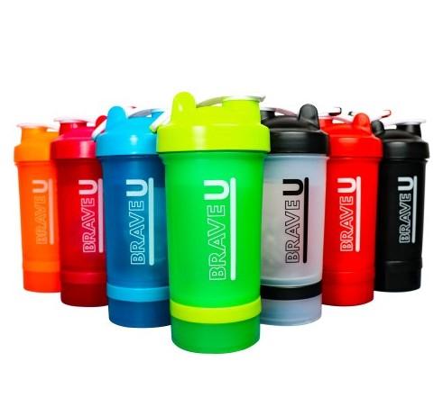 BraveU Шейкер з котейнерами 3 в 1 500 мл, для приготування спортивних коктейлів. В комплект входить основна колба 600 мл та 2 окремих контейнери 150 мл і 100 мл. В них можна помістити додатково добавки і носити з собою весь день. Також в одному відсіку є маленька таблетниця для капсул чи пігулок. Універсальний об'єм підходить для приготування всіх видів спортивного харчування, а металева кулька-вінчик допоможе швидко та якісно змішати ваш коктейль. Шейкер щільно закривається клапаном, та зроблений з якісного пластику без запаху.