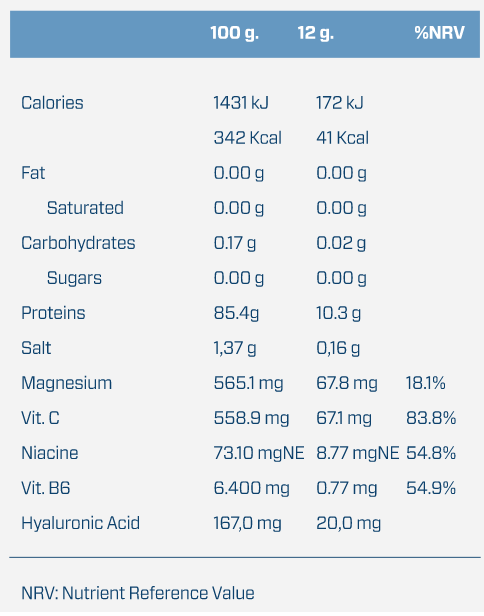 Бычий гидролизованный коллаген (Peptan®), карбонат магния, подкислитель (лимонная кислота), витамин C (L-аскорбат кальция), гиалуронат натрия, подсластитель (стевиол глюкозиды), ниацин (никотинамид) и витамин B6 (пиридоксин гидрохлорид). Может содержать следы злаков, содержащих глютен, ракообразных, яйца, рыбу, арахис, сою, молоко, орехи, люпин и их производные.