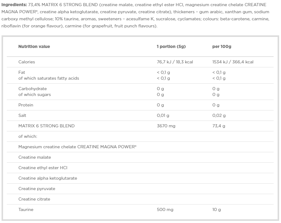 В составе, помимо всего, присутствует ещё и таурин, при том в реально хорошей дозировке - 500 мг! Креатин и таурин усиливают действие друг-друга, отличный продукт!