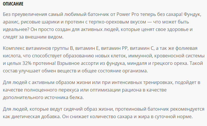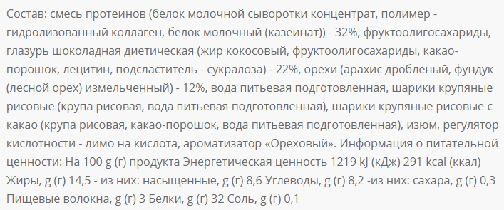 Вкусный перекус с отличным составом. Большое количество белка и полное отстутвие сахара.