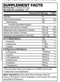 HydroBCAA® + Essentials содержит 150 мг электролитов и 10 г EAA, 7 г из которых представляют собой BCAA в соотношении 2: 1: 1 для оптимального восстановления и мышечного развития при регидратации организма.