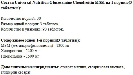 Способ применения Universal Nutrition Glucosamine Chondroitin MSM: Специалисты Юниверсал рекомендуют принимать данную добавку по 1-й таблетке 3 раза в день после каждого приема пищи.