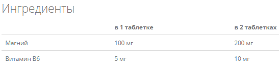 • Состав: магния лактат дигидрат, микрокристаллическая целлюлоза, мальтодекстрин, перекрёстно-сшитая карбоксиметилцеллюлоза, повидон, стеарат магния, пиридоксина гидрохлорид, диоксид кремния.