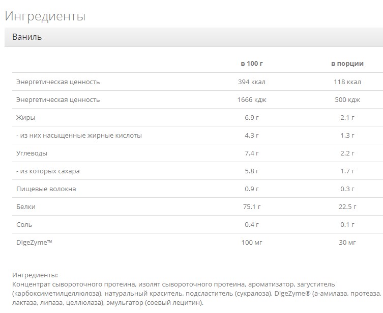 100% Platinum Whey – сывороточный протеин премиум класса. Протеин имеет высокую биологическую ценность, быстро активизирует и усиливает рост мышц и помогает поддерживать сухую мышечную массу. От достаточного количества белка также зависит общий тонус и способность организма противостоять инфекциям и вирусам. 100% Platinum Whey станет не только верным помощником тех, кто занимается в зале и наращивает мышечную массу, но и поможет укрепить иммунитет. • 22 г белка в порции • Обогащен комплексом энзимов DigeZyme™ (помогают организму лучше расщеплять и усваивать белок) • Сырье из молока коров травяного откорма • Высокое содержание незаменимых аминокислот • Низкое содержание жира и сахара • Большая линейка вкусов – выберите любимый! Характеристики: • Вкус: Печенье-крем • Вес: 2300 г (76 порций) Пищевая ценность на 100 г/30 г (порцию): • Энергетическая ценность 394 ккал 118 ккал • Энергетическая ценность 1663 кдж 499 кдж • Жиры 7 г 2.1 г • - из них насыщенные жирные кислоты 4.4 г 1.3 г • Углеводы 7.3 г 2.4 г • - из которых сахара 5.7 г 1.7 г • Пищевые волокна 1.2 г 0.4 г • Белки 74.8 г 22.4 г • Соль 0.4 г 0.1 г • DigeZyme™ 100 мг 30 мг Ингредиенты: Концентрат сывороточного протеина, изолят сывороточного протеина, ароматизатор, загуститель (карбоксиметилцеллюлоза), натуральный краситель, подсластитель (сукралоза), DigeZyme® (а-амилаза, протеаза, лактаза, липаза, целлюлаза), эмульгатор (соевый лецитин).