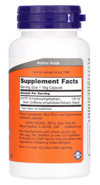 5-HTP 100mg NOW - промежуточный метаболит между аминокислотой L-триптофан и серотонином, получаемый из семян африканского растения Griffonia simplicifolia.
