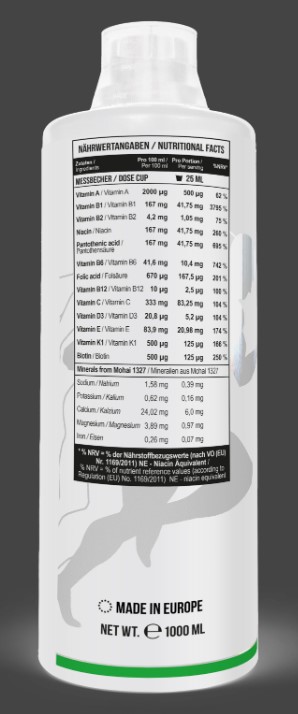 Healthy by MST® Multivitamin Liquid – рідкий вітамінно-мінеральний комплекс, за допомогою якого організм отримує збалансовану дозу корисних речовин у оптимальному поєднанні один з одним. Це мультивітамінна добавка, що включає вітаміни групи B, вітамін C, масляні жиророзчинні вітаміни A, Е і D, а також мінерали: калій, кальцій, магній, залізо і натрій. Рідкі вітаміни є добрим доповненням до основного щоденного раціону.