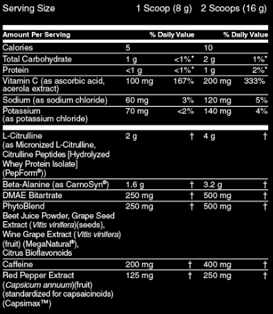 Бета-аланин снижает закисление мышечных тканей во время тренировки. 1,6 грамма – это та эффективная доза, которая помогает увеличить порог утомляемости организма, а также свести боль в мышцах к минимуму. На практике это означает, что принимая Platinum Pre- вы сможете заниматься дольше, а восстанавливаться значительно быстрее.