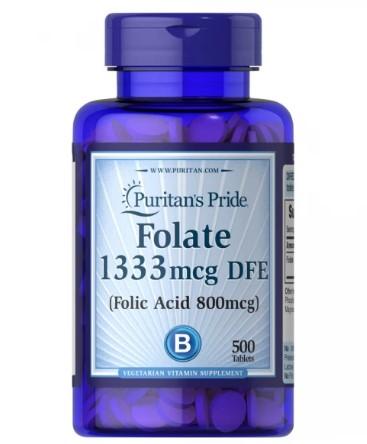 Puritan's Pride Folate 1333 mcg DFE - специальный продукт на основе фолиевой кислоты (витамина B9), прием которого положительно влияет на функции кишечника и печени, способствует образованию и нормальному функционированию белых кровяных телец, поддерживает иммунную систему и ускоряет биосинтез белка, а также обеспечивает максимальную продуктивность работы мозга.