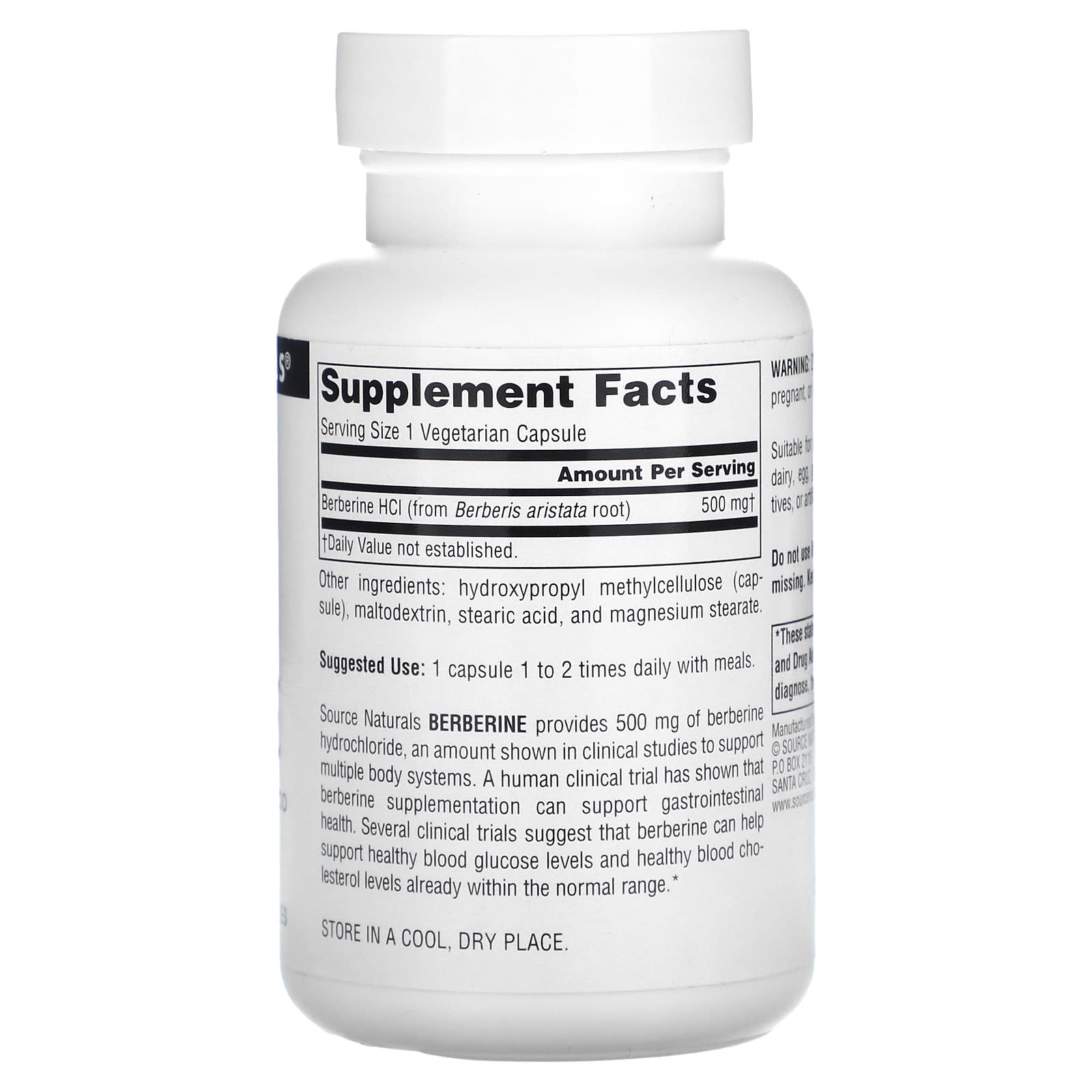 Берберин від Source Naturals містить 500 мг берберину гідрохлориду. Клінічні дослідження показали, що така кількість підтримує кілька систем в організмі. Клінічні випробування на людях показали, що добавки з берберином можуть підтримувати здоров’я шлунково-кишкового тракту. Кілька клінічних випробувань продемонстрували, що берберин може допомогти підтримувати нормальні рівні глюкози та холестерину в крові, що вже перебувають у межах норми.